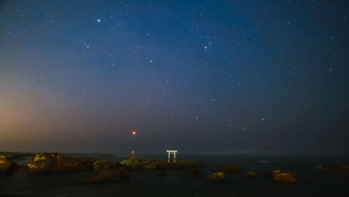 大洗星空撮影。 新月の日を狙って日光での星空撮影を予定していましたが、天気が良くなさそうだったので大洗へ場所を変更して撮影へ行ってきました。 近くにある大洗観光協会の駐車場から歩いて5分くらいで、大洗磯前神社 神磯の鳥居へ到着。 ヘッドライトを…